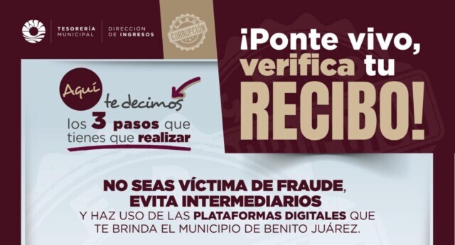 Cancún, Q. R., a 28 de febrero de 2026.- El Ayuntamiento de Benito Juárez, a través de la Dirección de Ingresos, invita a la ciudadanía a usar las plataformas digitales que cuenta el municipio como la verificación digital de recibos, una de las cinco acciones contundentes de la campaña “Cero corrupción” que tiene el propósito de consolidar una administración de resultados y con rendición de cuentas.
