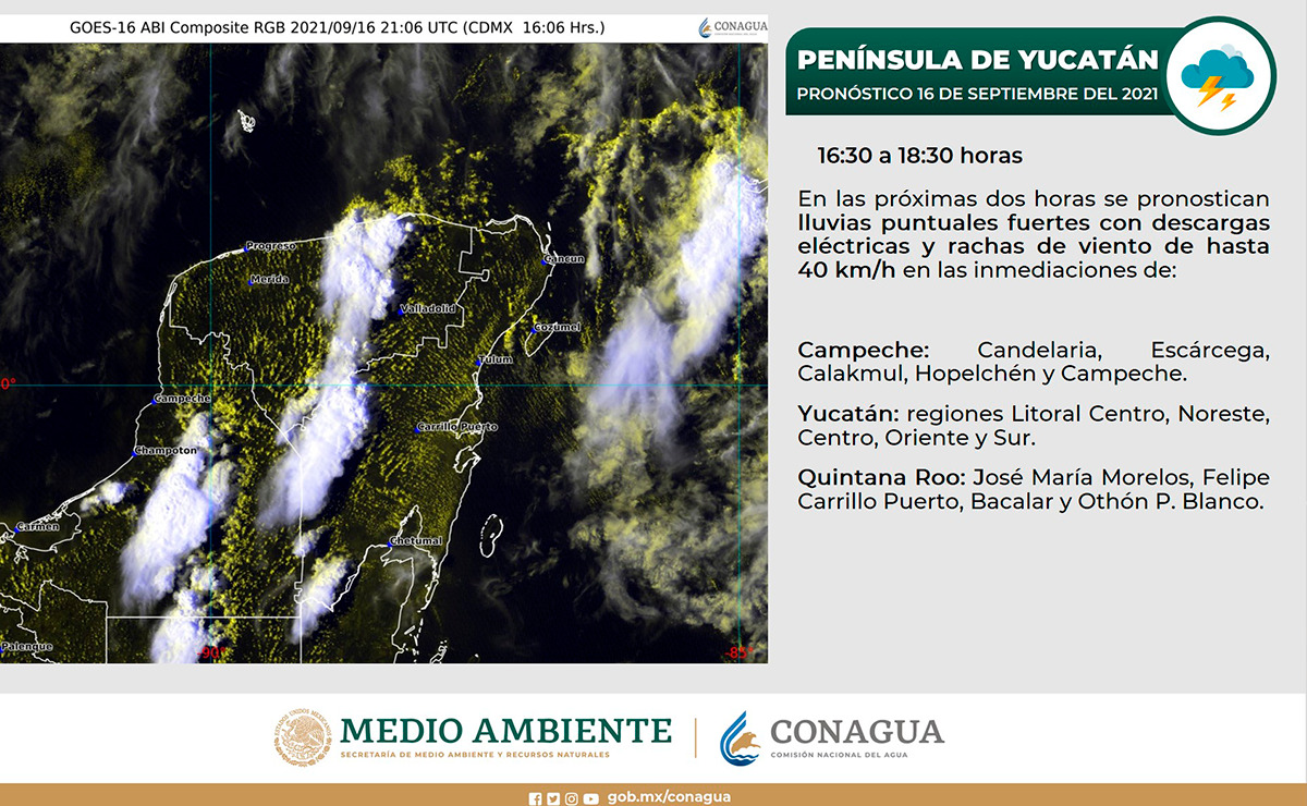 La Comisión Nacional del Agua (Conagua), anunció a través de un mensaje en su perfil de la red social Twiter, que durante las horas de la tarde de este jueves 16 de septiembre, se pronostica que existan las condiciones para fuertes lluvias en Quintana Roo.