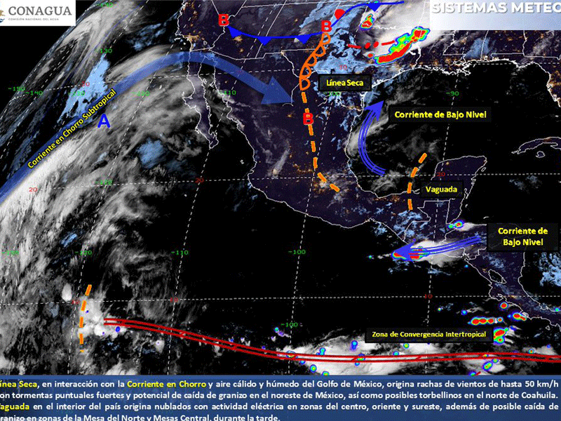Por otro lado, una vaguada en el interior del territorio nacional, propiciará el desarrollo de tormentas vespertinas, acompañadas de actividad eléctrica y rachas de viento en zonas del centro, oriente y sureste del país.