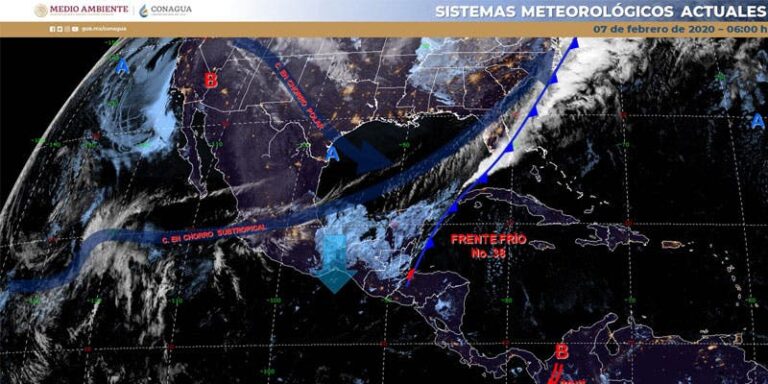 El frente frío No. 38, con características casi estacionario, se asocia a una vaguada prefrontal (canal de baja presión); ambos localizado sobre la porción central de la región Peninsular y hasta la porción norte de la Península de Florida.