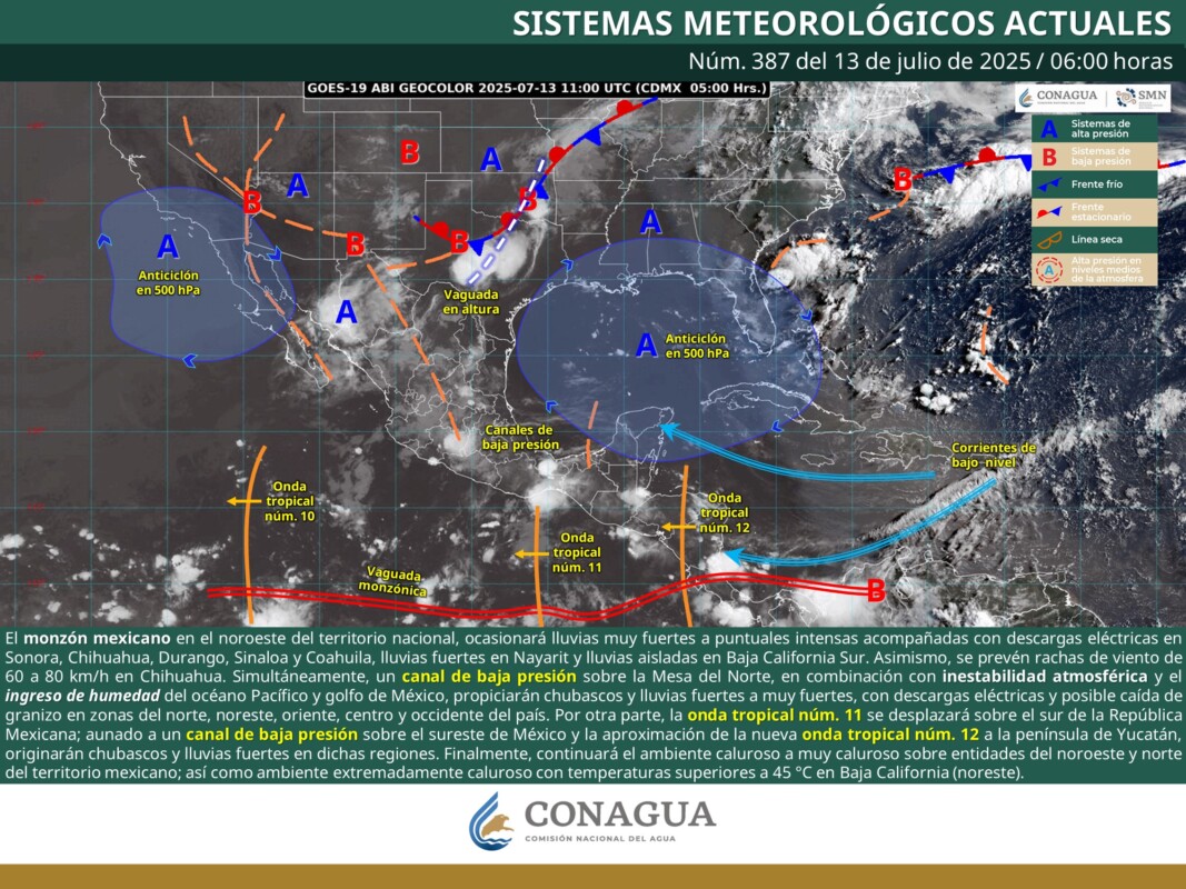 Pronóstico del clima en Quintana Roo para hoy domingo 13 de julio del 2025.- Este día, el monzón mexicano en el noroeste del territorio nacional, ocasionará lluvias muy fuertes a puntuales intensas acompañadas con descargas eléctricas en Sonora, Chihuahua, Durango, Sinaloa y Coahuila, lluvias fuertes en Nayarit y lluvias aisladas en Baja California Sur. Asimismo, se prevén rachas de viento de 60 a 80 km/h en Chihuahua.