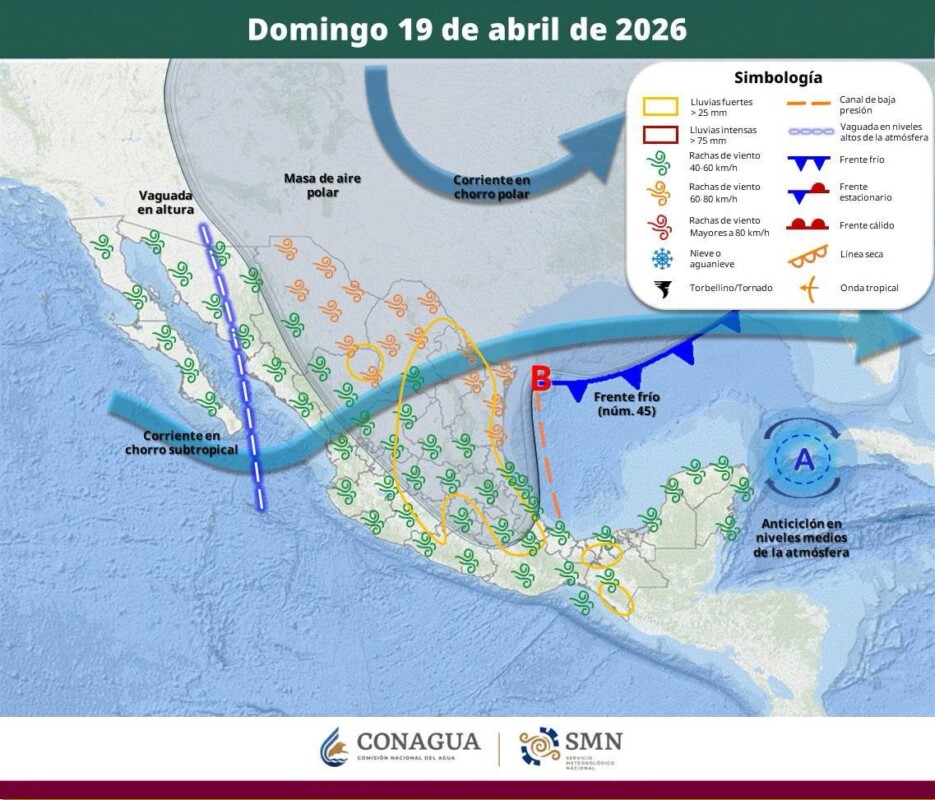Pronóstico del clima en Quintana Roo para hoy domingo 19 de abril 2026.- Este día, el frente frío núm. 45 se desplazará sobre el noreste del territorio mexicano y el litoral del golfo de México, interaccionará con un canal de baja presión extendido sobre el sureste del país, propiciando chubascos y lluvias fuertes en el noreste, centro y oriente del territorio nacional, además de lluvias puntuales muy fuertes en Tamaulipas (noreste), Nuevo León (centro y sur), Hidalgo (norte), Oaxaca (norte), Puebla (norte) y Veracruz (norte y centro).