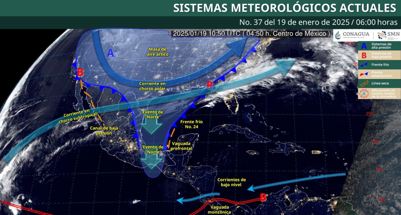A su vez, persistirá el evento de “Norte” muy fuerte con rachas de 70 a 90 km/h y oleaje de 2 a 4 metros de altura en Tamaulipas, Veracruz, Istmo y Golfo de Tehuantepec, y con rachas de 50 a 70 km/h en Tabasco, Campeche y Yucatán. Finalmente, el ingreso de humedad del océano Pacífico propiciará lluvias aisladas en Guerrero.