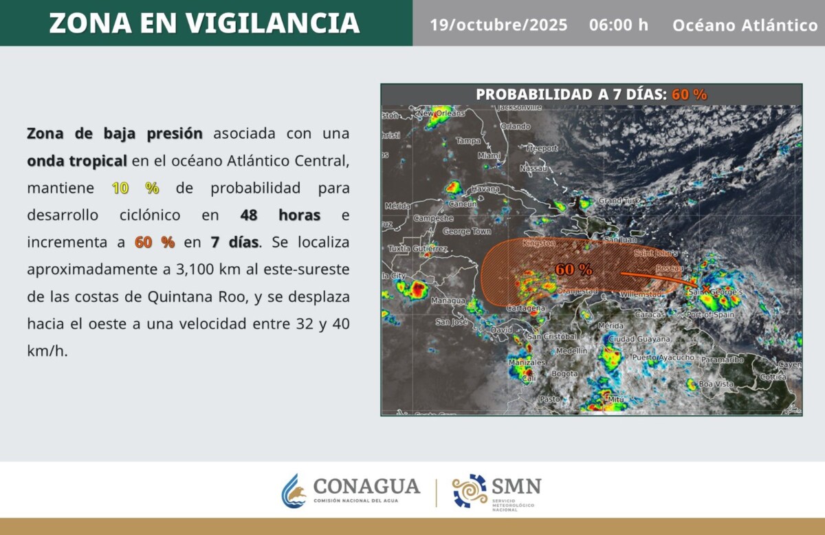 Pronóstico del clima en Quintana Roo para hoy domingo 19 de octubre 2025.- Este día, canales de baja presión se extenderán sobre la Península de Yucatán, el oriente y sureste mexicano, en interacción con una zona de baja presión con probabilidad para desarrollo ciclónico al sureste de las costas de Chiapas, y con desprendimientos nubosos de la vaguada monzónica e inestabilidad atmosférica, propiciarán lluvias fuertes a muy fuertes en las regiones mencionadas, y en el sur del territorio nacional; además de lluvias puntuales intensas en zonas de Veracruz, Oaxaca, Chiapas, Tabasco y Campeche.