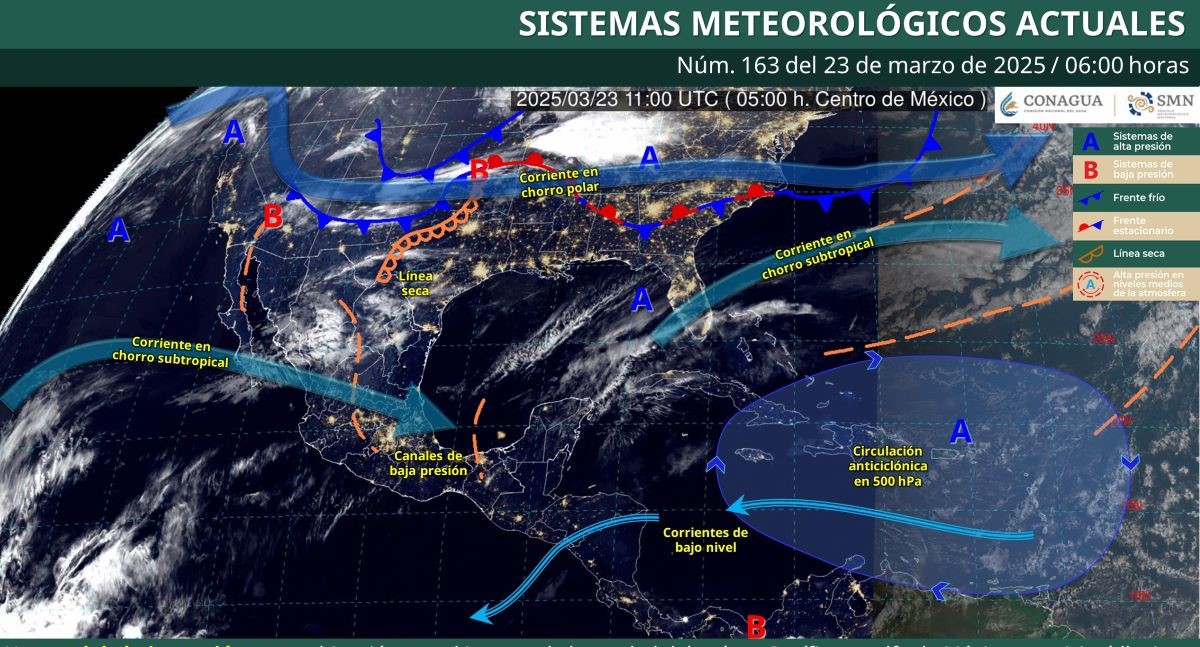 Pronóstico del clima en Quintana Roo para hoy domingo 23 de marzo 2025.- Para este día, un canal de baja presión en combinación con el ingreso de humedad del océano Pacífico y Golfo de México, propiciará lluvias e intervalos de chubascos en el noreste, occidente, centro, oriente y sureste del territorio nacional, incluida la península de Yucatán.