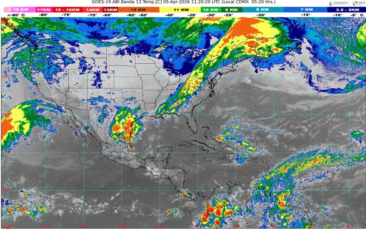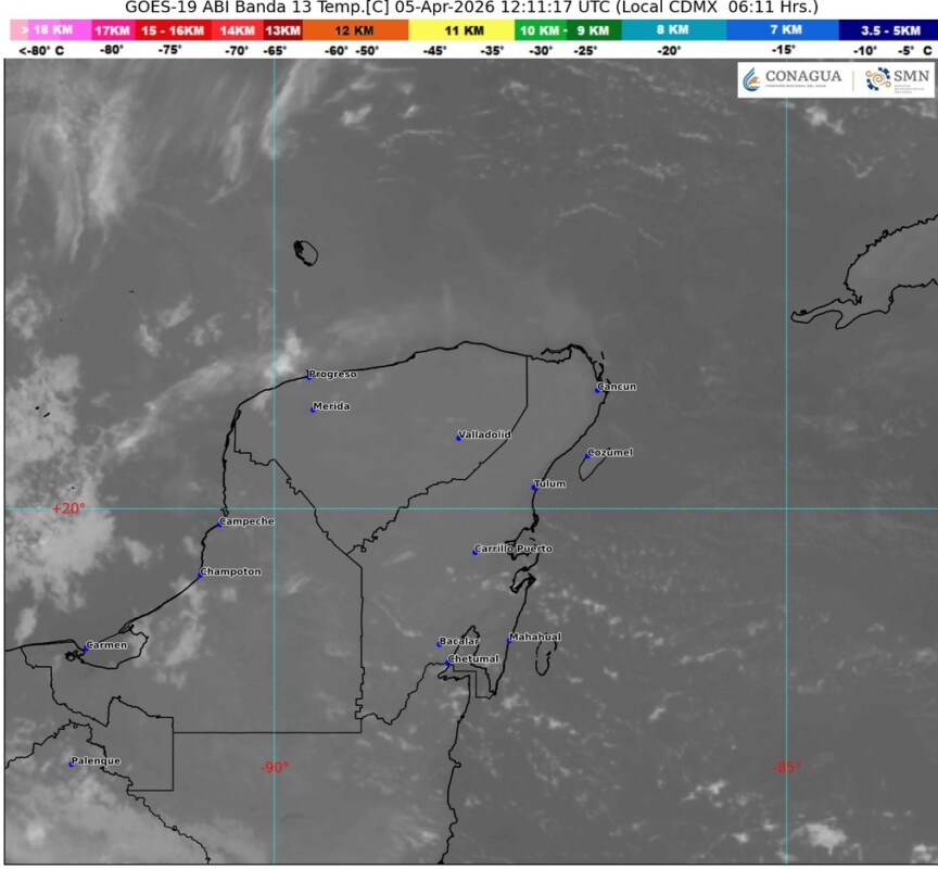 Pronóstico del clima en Quintana Roo para hoy domingo 5 de abril 2026.- Este día, un nuevo frente frío (número 43) se extenderá cerca de la frontera noroeste y norte del país, interaccionará con una línea seca, originando chubascos y lluvias fuertes acompañadas con descargas eléctricas y probables granizadas en Coahuila, Nuevo León, Tamaulipas y San Luis Potosí; además, se prevén rachas de viento de 60 a 80 km/h y posible formación de torbellinos o tornados en el norte de Coahuila, Nuevo León y Tamaulipas.