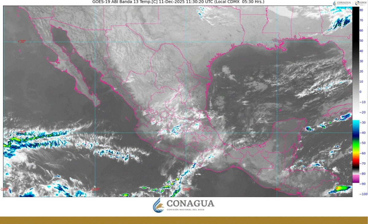 Pronóstico del clima en Quintana Roo para hoy jueves 11 de diciembre 2025.- Este día, el frente frío número 20 se extenderá sobre el noreste de México, ocasionará fuertes rachas de viento en Coahuila, Nuevo León y Tamaulipas. Por otra parte, canales de baja presión sobre el centro y sureste del país, en combinación con el ingreso de humedad del océano Pacífico y Golfo de México e inestabilidad atmosférica, ocasionarán lluvias y chubascos en estados del occidente, centro, oriente, sur y sureste del territorio nacional, incluida la Península de Yucatán, con lluvias puntuales fuertes en Michoacán (centro), Chiapas (este), Tabasco (centro y este), Campeche (este) y Quintana Roo (centro y sur).
