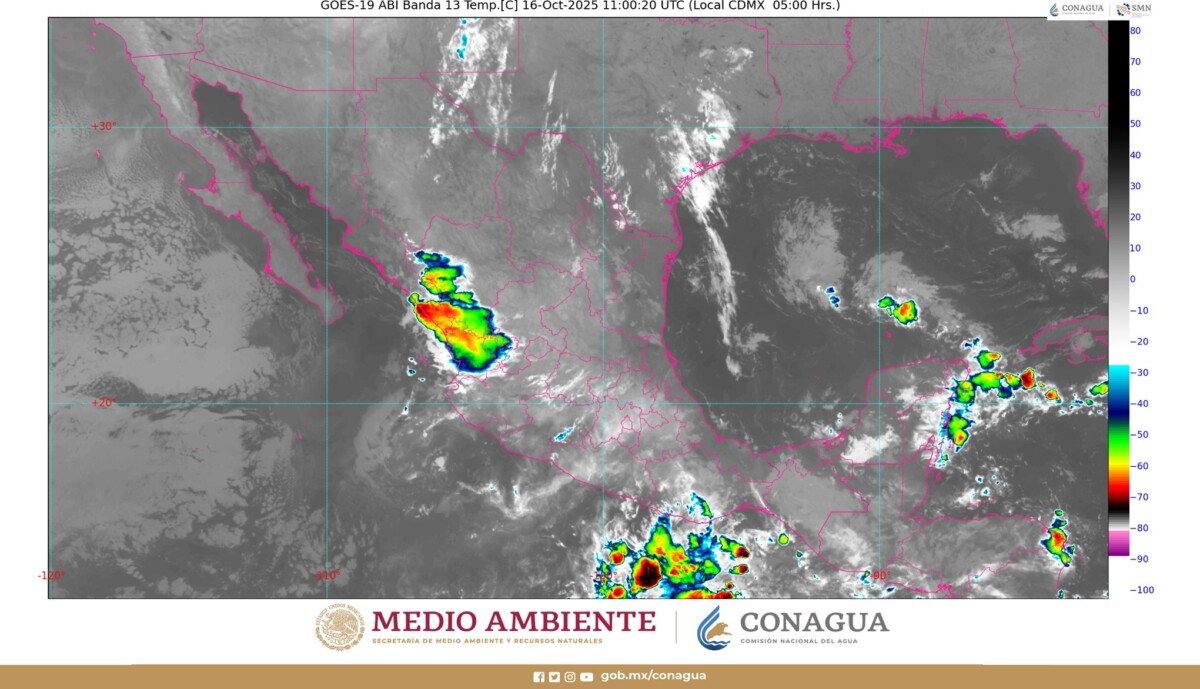 Pronóstico del clima en Quintana Roo para hoy jueves 16 de octubre 2025.- Para este día, el sistema frontal número 7 se extenderá con características de estacionario sobre el norte del país, interaccionará con una vaguada en niveles medios y altos de la atmósfera, y con la corriente en chorro subtropical, lo que ocasionará descenso de temperatura y rachas fuertes de viento en las región mencionada, además del noroeste mexicano, así como lluvias puntuales fuertes en Chihuahua; e intervalos de chubascos en Coahuila.