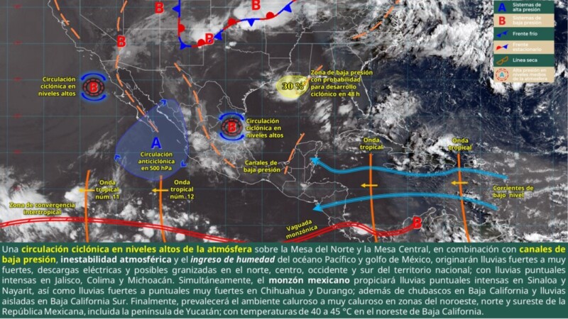 Simultáneamente, el monzón mexicano propiciará lluvias puntuales intensas en Sinaloa y Nayarit, así como lluvias fuertes a puntuales muy fuertes en Chihuahua y Durango; además de chubascos en Baja California y lluvias aisladas en Baja California Sur.