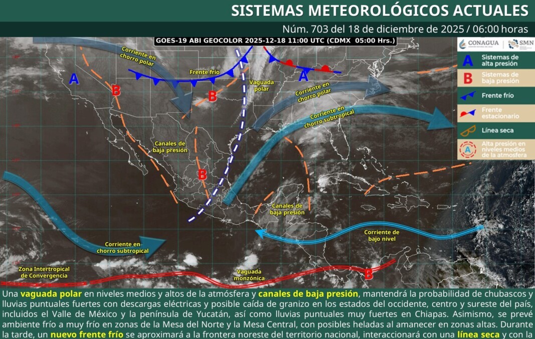 Pronóstico del clima en Quintana Roo para hoy jueves 18 de diciembre 2025.- Este día, una vaguada polar en niveles medios y altos de la atmósfera y canales de baja presión en el interior del territorio nacional, mantendrán la probabilidad de chubascos y lluvias puntuales fuertes con descargas eléctricas y posible caída de granizo en los estados del occidente, centro y sureste del país, incluidos el Valle de México y la Península de Yucatán, así como lluvias puntuales muy fuertes en Chiapas.