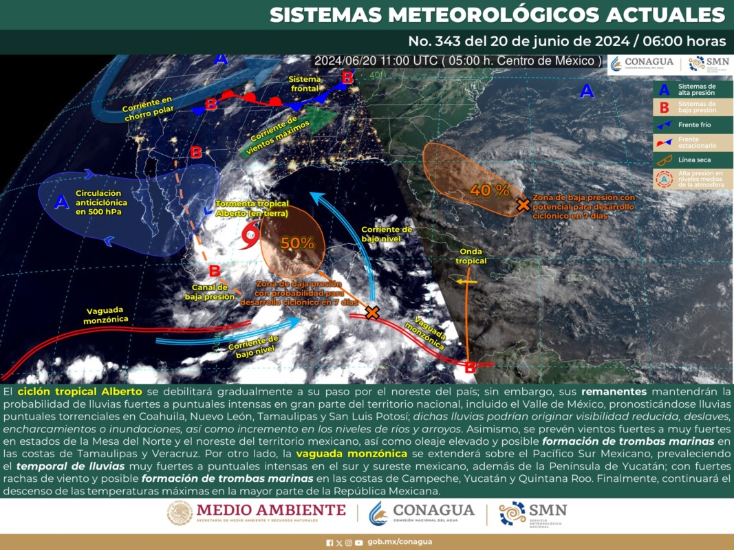 Pronóstico del clima en Quintana Roo para hoy jueves 20 de junio 2924.- Durante este día, el ciclón tropical Alberto se debilitará gradualmente a su paso por el noreste del país; sin embargo, sus remanentes mantendrán la probabilidad de lluvias fuertes a puntuales intensas en gran parte del territorio nacional, incluido el Valle de México, pronosticándose lluvias puntuales torrenciales en Coahuila, Nuevo León, Tamaulipas y San Luis Potosí.