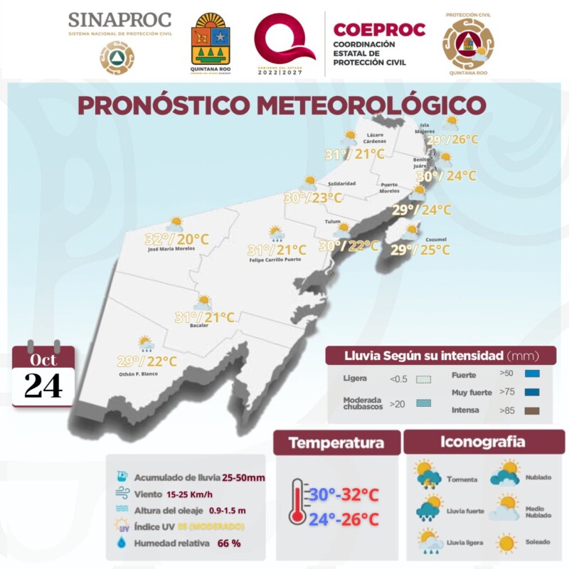 Pronóstico del clima en Quintana Roo para hoy jueves 24 de octubre 2024.- Para este día, canales de baja presión sobre el noreste, occidente, oriente, sur y sureste mexicano, además de la Península de Yucatán, en interacción con el ingreso de humedad del océano Pacífico, golfo de México y mar Caribe, e inestabilidad en niveles altos de la atmósfera, ocasionarán lluvias y chubascos en las regiones mencionadas, con lluvias puntuales fuertes en Guerrero, Oaxaca, Chiapas, Tabasco y Quintana Roo.