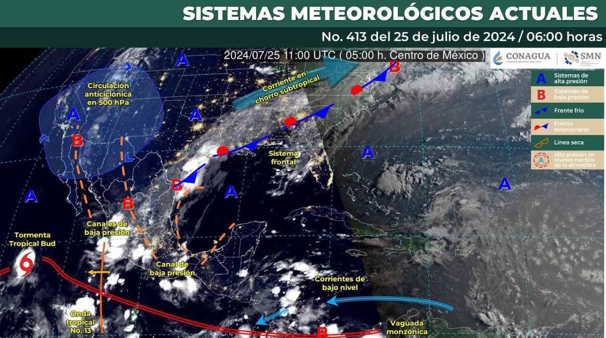 La onda tropical No. 13 frente a las costas de Jalisco y Colima, en interacción con un canal de baja presión en el occidente del territorio nacional, generarán lluvias puntuales intensas en Nayarit, Jalisco, Colima y Michoacán; lluvias puntuales muy fuertes en Guerrero y Aguascalientes.