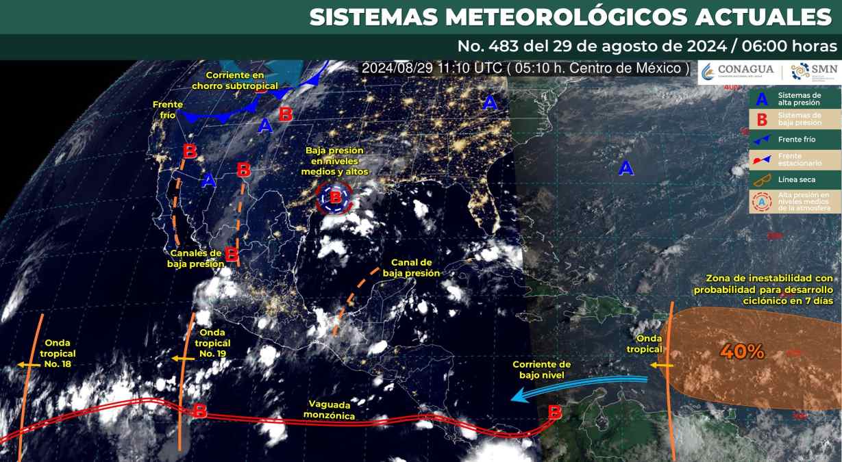 Pronóstico del clima en Quintana Roo para hoy jueves 29 de agosto 2024.- Este día, el monzón mexicano en interacción con inestabilidad en niveles altos de la atmósfera, propiciará lluvias fuertes en el noroeste de México, además de lluvias y chubascos en la península de Baja California. Por otra parte, canales de baja presión y el ingreso de humedad de ambos océanos, ocasionarán chubascos y lluvias fuertes a muy fuertes sobre la mayor parte del territorio nacional, así como lluvias puntuales intensas en regiones de Chiapas, Oaxaca y Guerrero. Finalmente, se prevén temperaturas máximas de 40 a 45 °C en zonas de Baja California, Baja California Sur y Sonora.