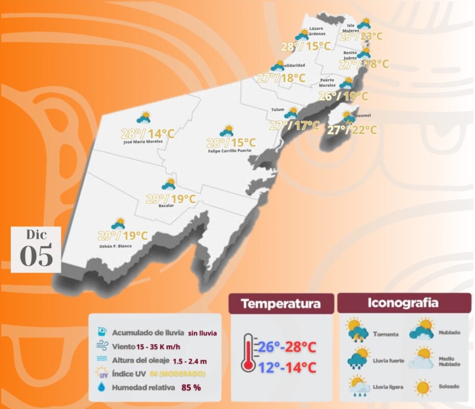 Pronóstico del clima en Quintana Roo para hoy jueves 5 de diciembre 2024; cielo parcialmente nublado durante el día y sin lluvia en la Península.