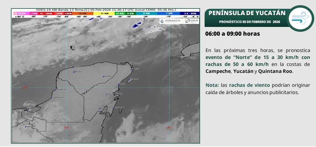 Península de Yucatán: Cielo medio nublado a nublado durante el día, con probabilidad de chubascos en Campeche, así como lluvias aisladas en Yucatán y Quintana Roo. Por la mañana ambiente fresco a templado y durante la tarde ambiente templado a cálido. Evento de “Norte” de 30 a 40 km/h con rachas de 50 a 70 km/h y oleaje de 2.0 a 3.0 metros de altura en costas de Campeche, Yucatán y Quintana Roo.