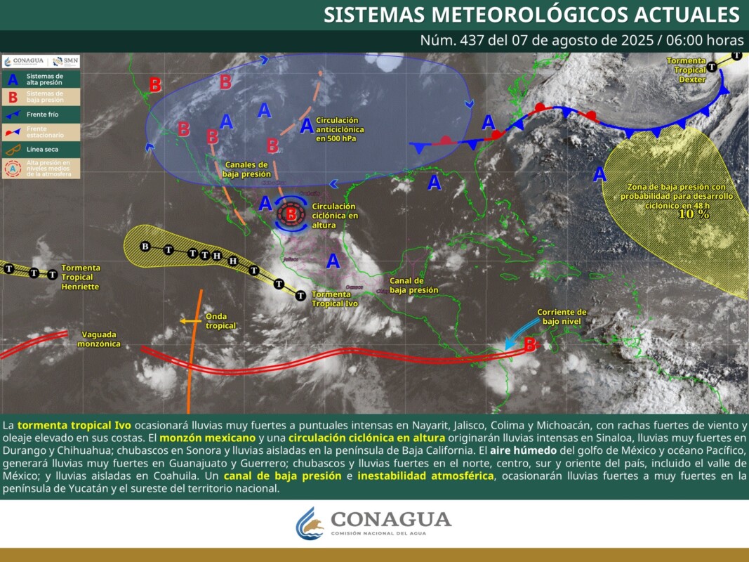 Pronóstico del clima en Quintana Roo para hoy jueves 7 de agosto 2025.- Para este día, la tormenta tropical «Ivo» se desplazará frente a las costas del Pacífico central mexicano; sus desprendimientos nubosos ocasionarán lluvias intensas en Nayarit y Jalisco; y puntuales muy fuertes en Colima y Michoacán, así como rachas fuertes de viento y oleaje elevado en las costas de dichos estados. Por otra parte, el monzón mexicano y una circulación ciclónica en altura mantendrán la probabilidad de lluvias puntuales intensas en Sinaloa; puntuales muy fuertes en Durango y Chihuahua; chubascos en Sonora; y lluvias aisladas en zonas de Baja California Sur y Baja California.