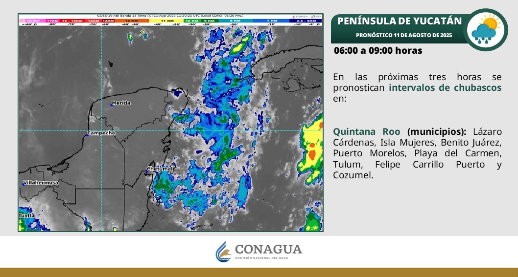 Pronóstico del clima en Quintana Roo para hoy lunes 11 de agosto 2025; cielo nublado con lluvias puntuales muy fuertes en Campeche y Yucatán, y puntuales fuertes en Quintana Roo.