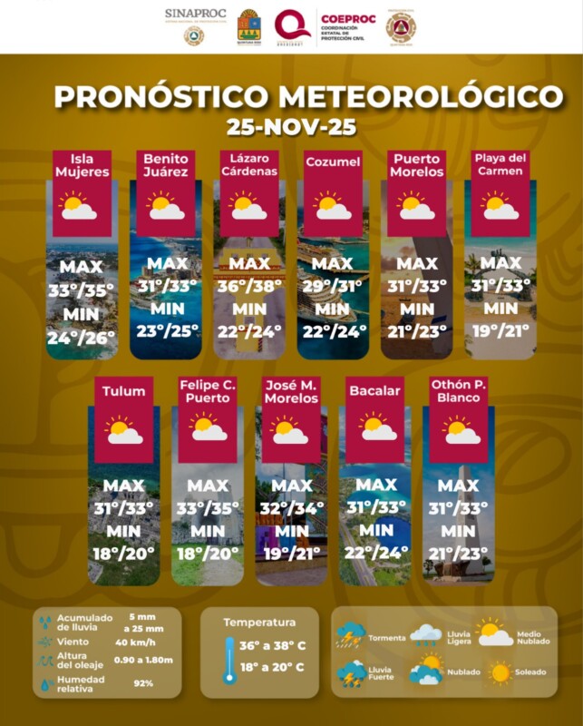 Pronóstico del clima en Quintana Roo para hoy lunes 19 de enero 2026.- Para este día, el frente frío número 29 se desplazará sobre el mar Caribe, sin afectar a la República Mexicana; sin embargo, su masa de aire polar cubrirá el Golfo de México, generando viento de componente norte con rachas de 70 a 90 km/h en el Istmo y Golfo de Tehuantepec (Oaxaca y Chiapas) y rachas de 30 a 50 km/h en costas de Veracruz (sur), Tabasco, Campeche, Yucatán y Quintana Roo.