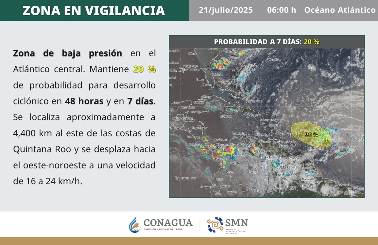 Pronóstico del clima en Quintana Roo para hoy lunes 21 de julio 2025.- Para este día, el monzón mexicano en combinación con una circulación ciclónica en altura sobre el noroeste del país, ocasionará chubascos y lluvias fuertes en dicha región, así como lluvias puntuales muy fuertes en Sonora y Chihuahua.