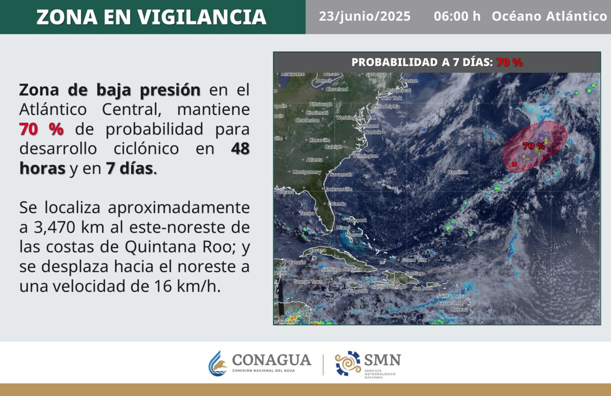 Pronóstico del clima en Quintana Roo para hoy lunes 23 de junio 2025.- Este día, se mantendrá el temporal de lluvias sobre gran parte de la República Mexicana, debido a canales de baja presión que en combinación con inestabilidad atmosférica y el ingreso de humedad de ambos océanos, además de la proximidad de la vaguada monzónica y de la onda tropical número 5, asociada con una zona de baja presión con probabilidad para desarrollo ciclónico al sur de El Salvador; originarán chubascos y lluvias fuertes a muy fuertes sobre la Mesa del Norte, el occidente, centro, noreste, oriente, sur y sureste del territorio nacional, incluida la Península de Yucatán.