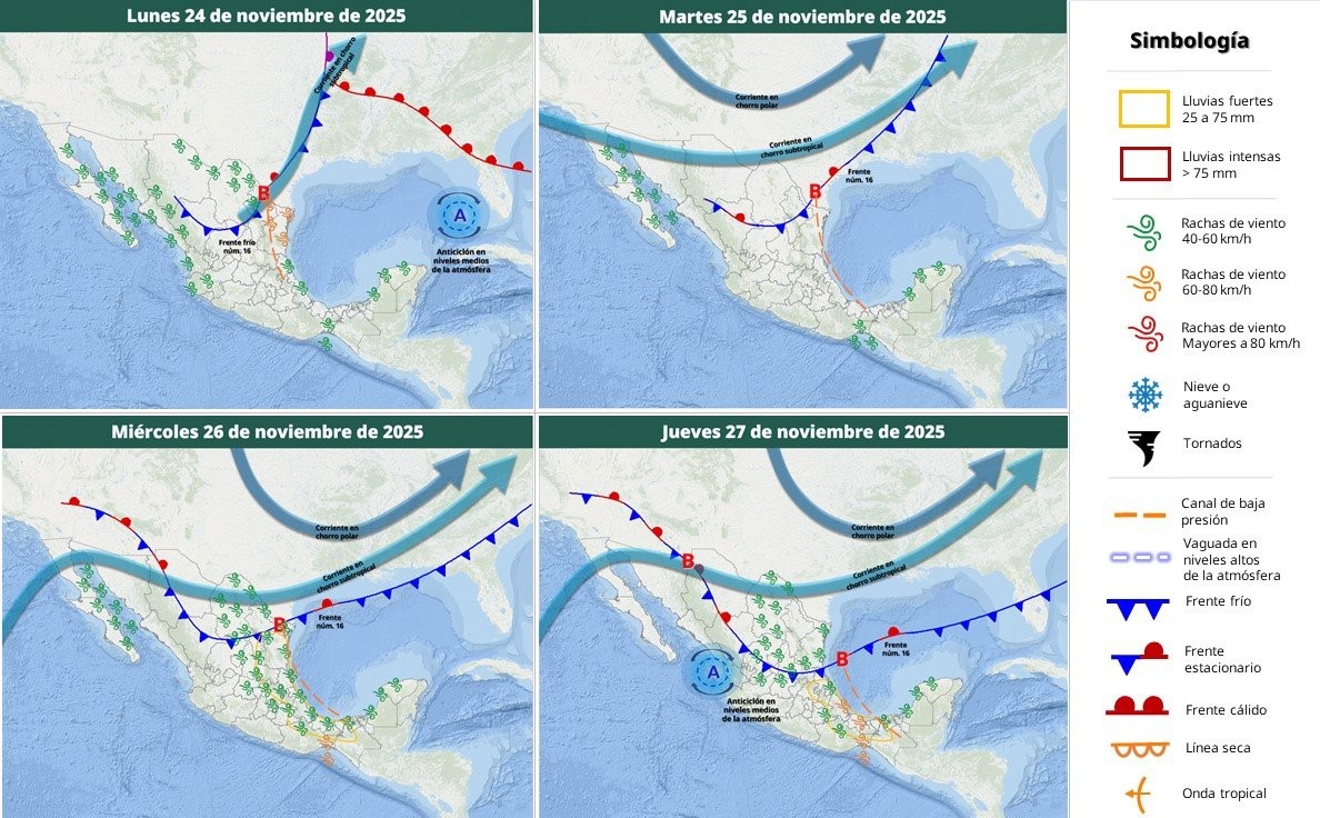 Pronóstico del clima en Quintana Roo para hoy lunes 24 de noviembre 2025.- Este día, el frente frío número 16 se extenderá sobre la Mesa del Norte y noreste de México, continuará su interacción con una vaguada polar y con la corriente en chorro subtropical, manteniendo el descenso de temperatura, rachas de viento y lluvias aisladas en las regiones mencionadas.