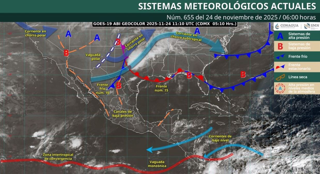 Pronóstico del clima en Quintana Roo para hoy lunes 24 de noviembre 2025.- Este día, el frente frío número 16 se extenderá sobre la Mesa del Norte y noreste de México, continuará su interacción con una vaguada polar y con la corriente en chorro subtropical, manteniendo el descenso de temperatura, rachas de viento y lluvias aisladas en las regiones mencionadas.