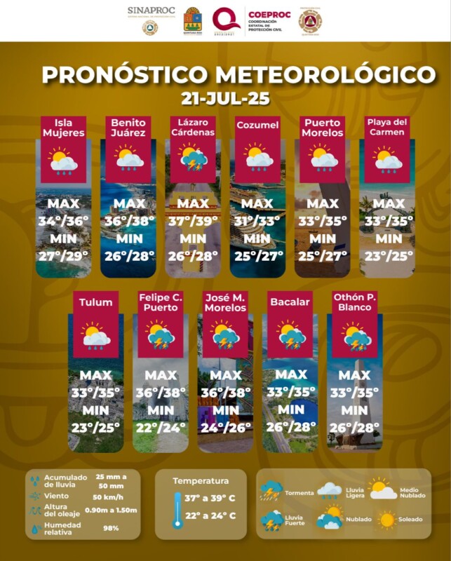 Pronóstico del clima en Quintana Roo para hoy martes 22 de julio 2025.- Para hoy, el monzón mexicano sobre el noroeste del país en interacción con una circulación ciclónica en altura sobre el sur del golfo de California, ocasionarán lluvias puntuales muy fuertes en Durango y Chihuahua, puntuales fuertes en Nayarit y Sinaloa, intervalos de chubascos en Sonora y lluvias aisladas en zonas de Baja California Sur.