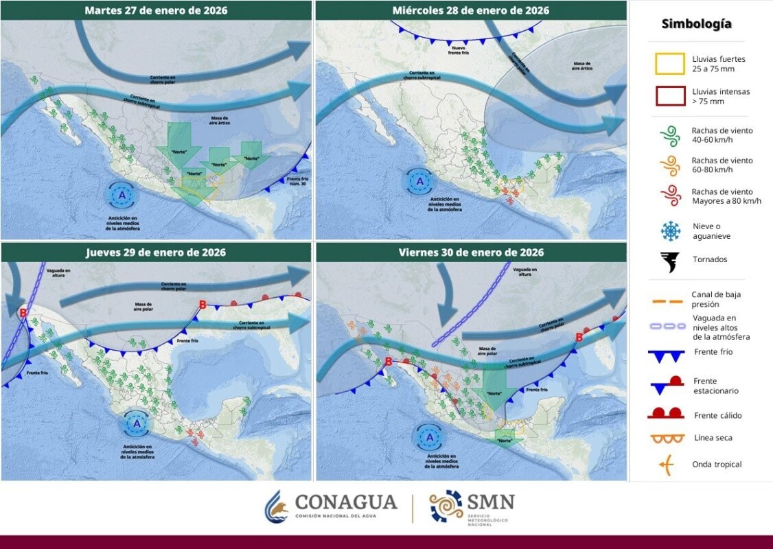 Asimismo, persistirá el evento de “norte” con rachas de viento de 90 a 110 km/h en el Istmo y Golfo de Tehuantepec; de 60 a 80 km/h en Veracruz; de 50 a 70 km/h en Quintana Roo; y rachas de 40 a 60 km/h en Tamaulipas, Tabasco, Campeche y Yucatán.