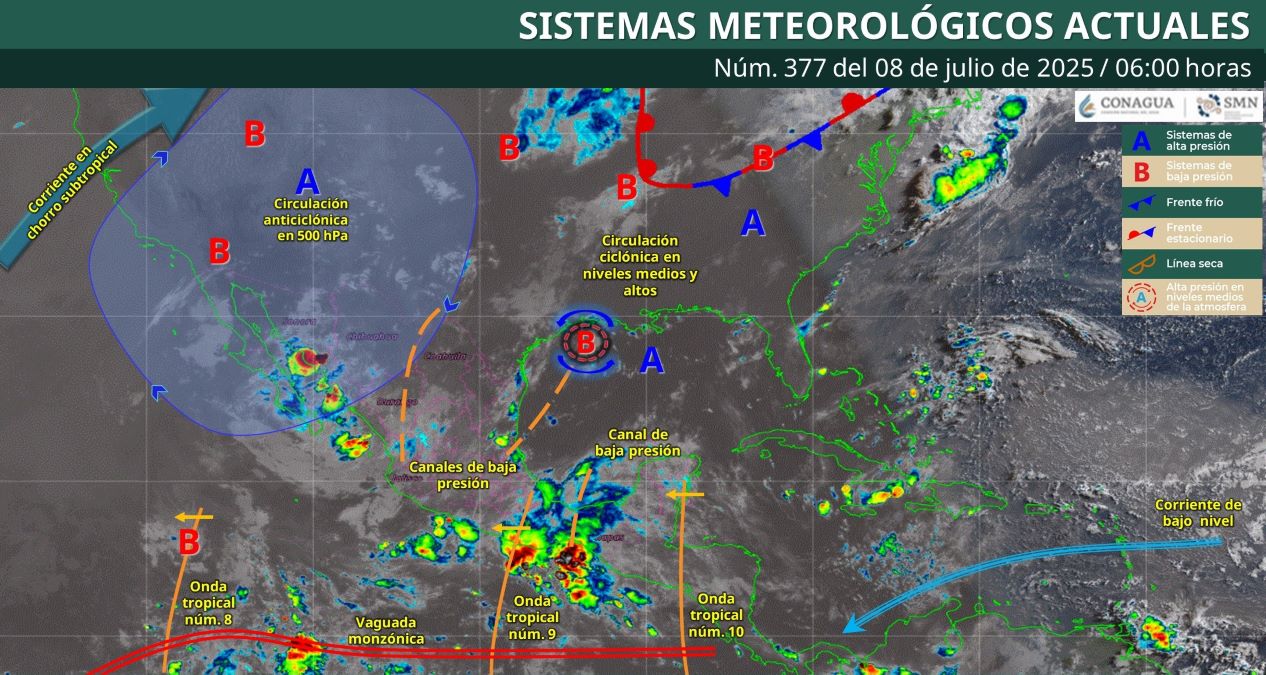 Por su parte, la onda tropical número 10 que se desplazará sobre la Península de Yucatán y el ingreso de humedad del mar Caribe y Golfo de México, en interacción con un canal de baja presión en el sureste mexicano, generarán lluvias puntuales muy fuertes en Chiapas y puntuales fuertes en Quintana Roo, Yucatán, Campeche y Tabasco