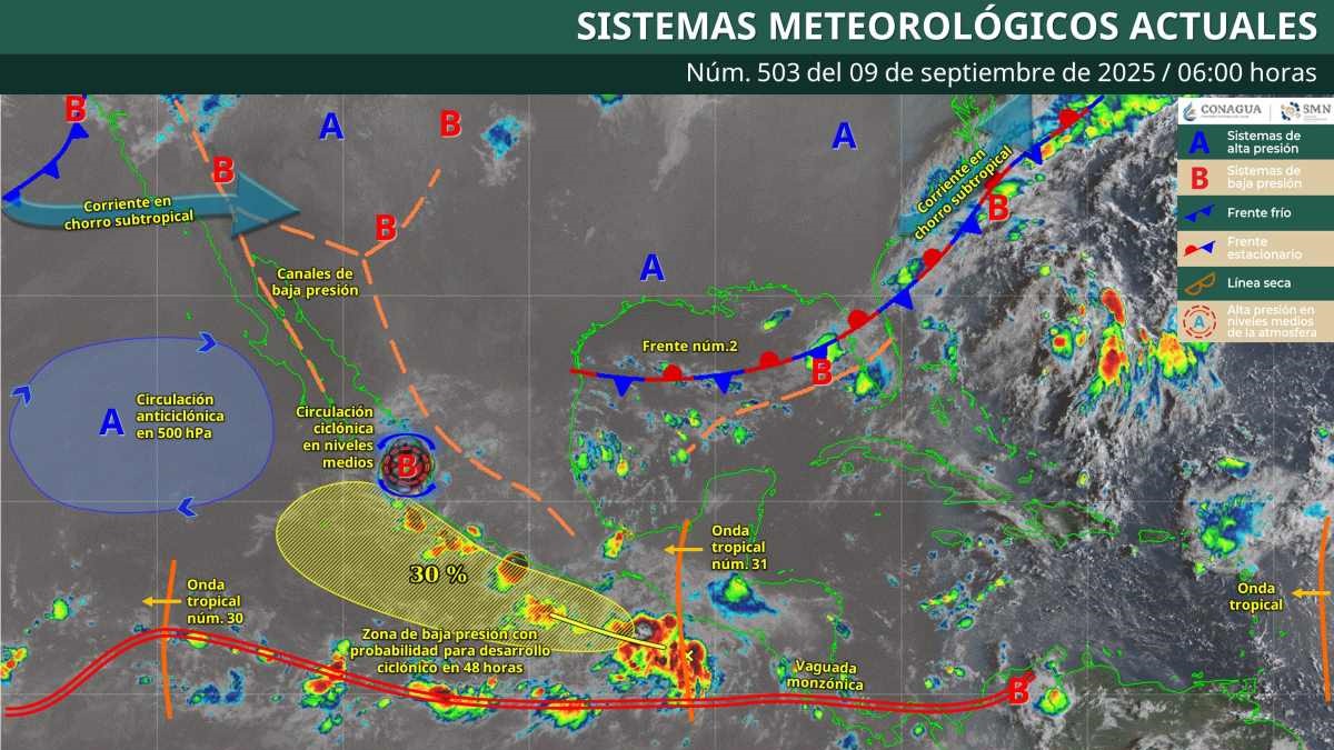 Simultáneamente, la onda tropical número 31 se desplazará sobre el sureste mexicano, asociada con una zona de baja presión con probabilidad para desarrollo ciclónico al sur del Golfo de Tehuantepec y, en interacción con el ingreso de humedad del Golfo de México y mar Caribe, originarán lluvias puntuales intensas en Oaxaca y Chiapas; muy fuertes en Veracruz, Tabasco, Campeche y Yucatán, así como lluvias fuertes en Quintana Roo.