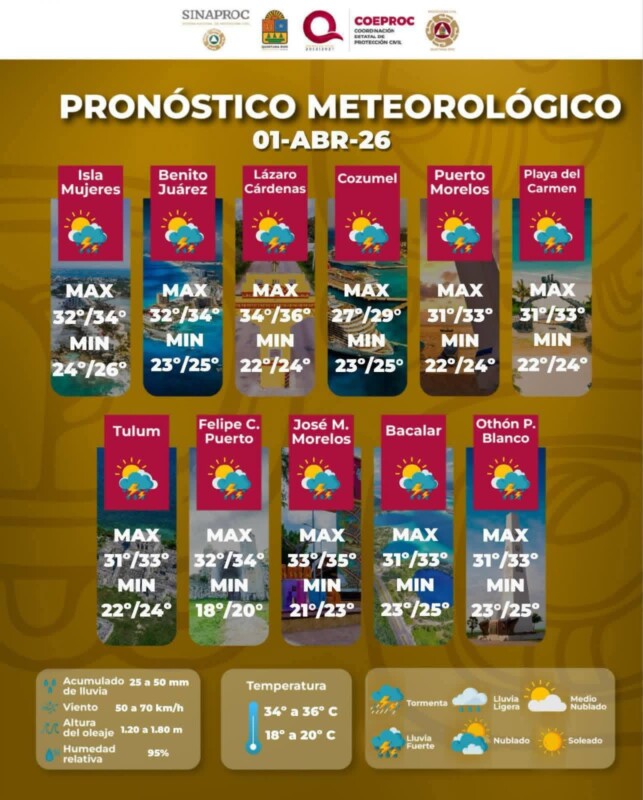 Pronóstico del clima en Quintana Roo para hoy miércoles 1 de abril 2026.- Este día, una vaguada en niveles medios y altos de la atmósfera se desplazará sobre el sureste del país y la Península de Yucatán, interaccionará con la corriente en chorro subtropical y con inestabilidad atmosférica, generando rachas de viento, chubascos y lluvias fuertes con descargas eléctricas y posible caída de granizo en dichas regiones, así como lluvias puntuales muy fuertes en Chiapas y Tabasco.