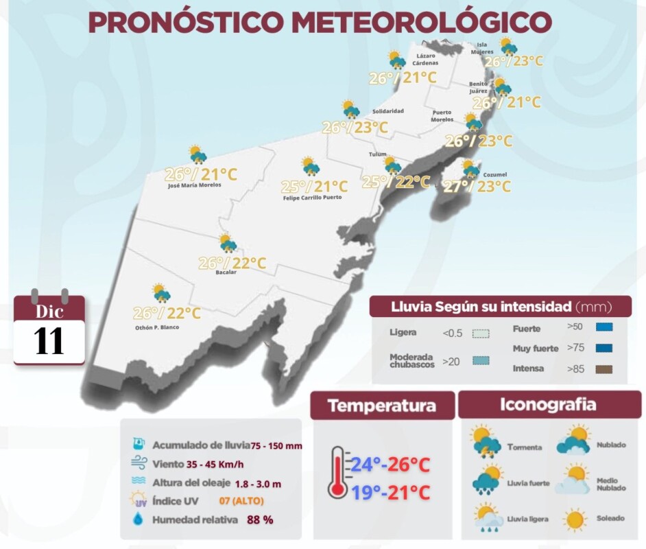 Pronóstico del clima en Quintana Roo para hoy miércoles 11 de diciembre 2024; se prevén lluvias por la presencia del frente frío No. 14.