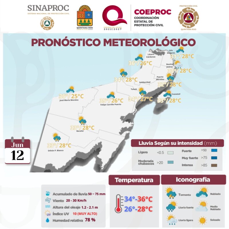 Pronóstico del clima en Quintana Roo para hoy miércoles 12 de junio 2024.- Este día, una zona de inestabilidad con probabilidad para desarrollo ciclónico en el Golfo de Tehuantepec, en interacción con un centro de baja presión sobre la Península de Yucatán, un canal de baja presión en el sureste del país y la vaguada monzónica que se extenderá muy próxima a las costas del Pacífico Sur Mexicano, mantendrán el temporal de lluvias puntuales intensas con descargas eléctricas.