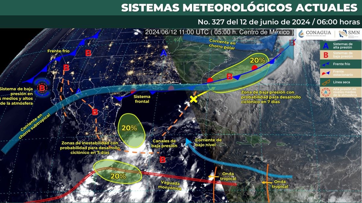 Pronóstico del clima en Quintana Roo para hoy miércoles 12 de junio 2024.- Este día, una zona de inestabilidad con probabilidad para desarrollo ciclónico en el Golfo de Tehuantepec, en interacción con un centro de baja presión sobre la Península de Yucatán, un canal de baja presión en el sureste del país y la vaguada monzónica que se extenderá muy próxima a las costas del Pacífico Sur Mexicano, mantendrán el temporal de lluvias puntuales intensas con descargas eléctricas.