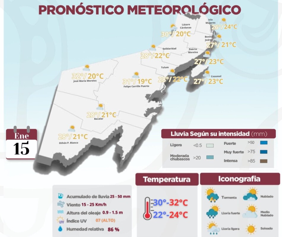 Pronóstico del clima en Quintana Roo para hoy miércoles 15 de enero 2025; cielo medio nublado con probabilidad de lluvias fuertes y posibles descargas eléctricas.