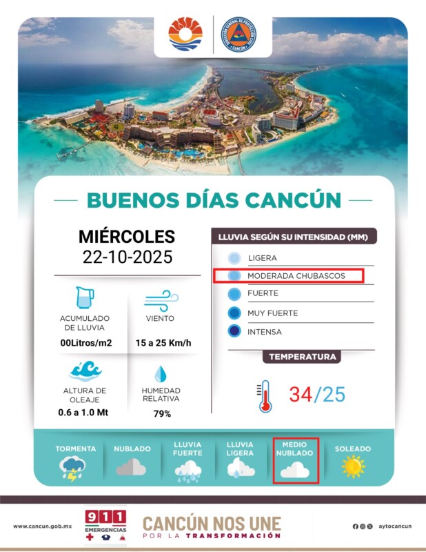 Pronóstico del clima en Quintana Roo para hoy miércoles 22 de octubre 2025.- Este día, un canal de baja presión sobre el oriente y sureste del país, en interacción con la entrada de humedad del Golfo de México e inestabilidad atmosférica, ocasionarán lluvias muy fuertes en Veracruz, Tabasco, Oaxaca y Chiapas, así como fuertes en Puebla.