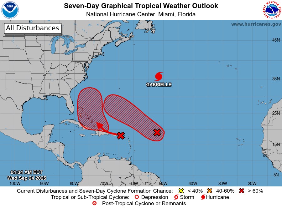 La circulación y los desprendimientos nubosos del huracán «Narda» en combinación con inestabilidad atmosférica propiciarán lluvias puntuales intensas en Jalisco (oeste); y puntuales muy fuertes en Michoacán y Colima, así como rachas de viento y oleaje elevado en el occidente mexicano. La onda tropical número 34 recorrerá el sureste y sur del país, ocasionará lluvias puntuales intensas en Oaxaca y Guerrero; y puntuales muy fuertes en Chiapas.