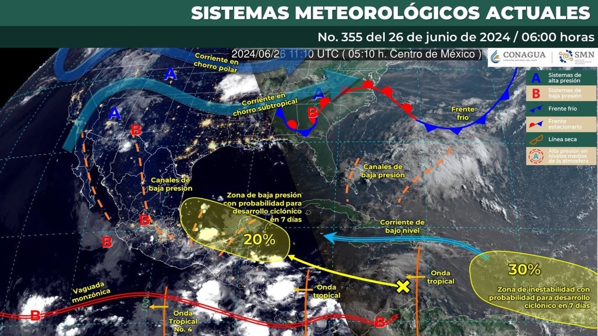 Pronóstico del clima en Quintana Roo para hoy miércoles 26 de junio 2024.- Este día, canales de baja presión se extenderán sobre las Sierras Madre Occidental y Oriental, aunados a inestabilidad en niveles altos de la atmósfera y al ingreso de humedad del Océano Pacífico y Golfo de México, producirán lluvias fuertes a muy fuertes en dichas regiones, con lluvias puntuales intensas en Sonora, Chihuahua, Puebla y Veracruz.