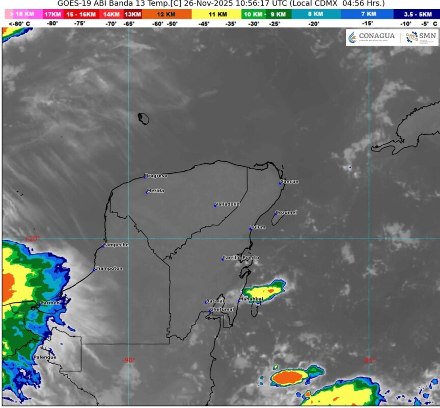 Pronóstico del clima en Quintana Roo para hoy miércoles 26 de noviembre 2025.- Este día, el frente frío número 16 será reforzado por una masa de aire polar, por lo que se desplazará sobre el noreste y oriente del territorio nacional, y en interacción con un canal de baja presión sobre el suroeste del Golfo de México y el sureste mexicano, ocasionarán lluvias fuertes a muy fuertes en el noreste, oriente y sureste del país, incluida la Península de Yucatán