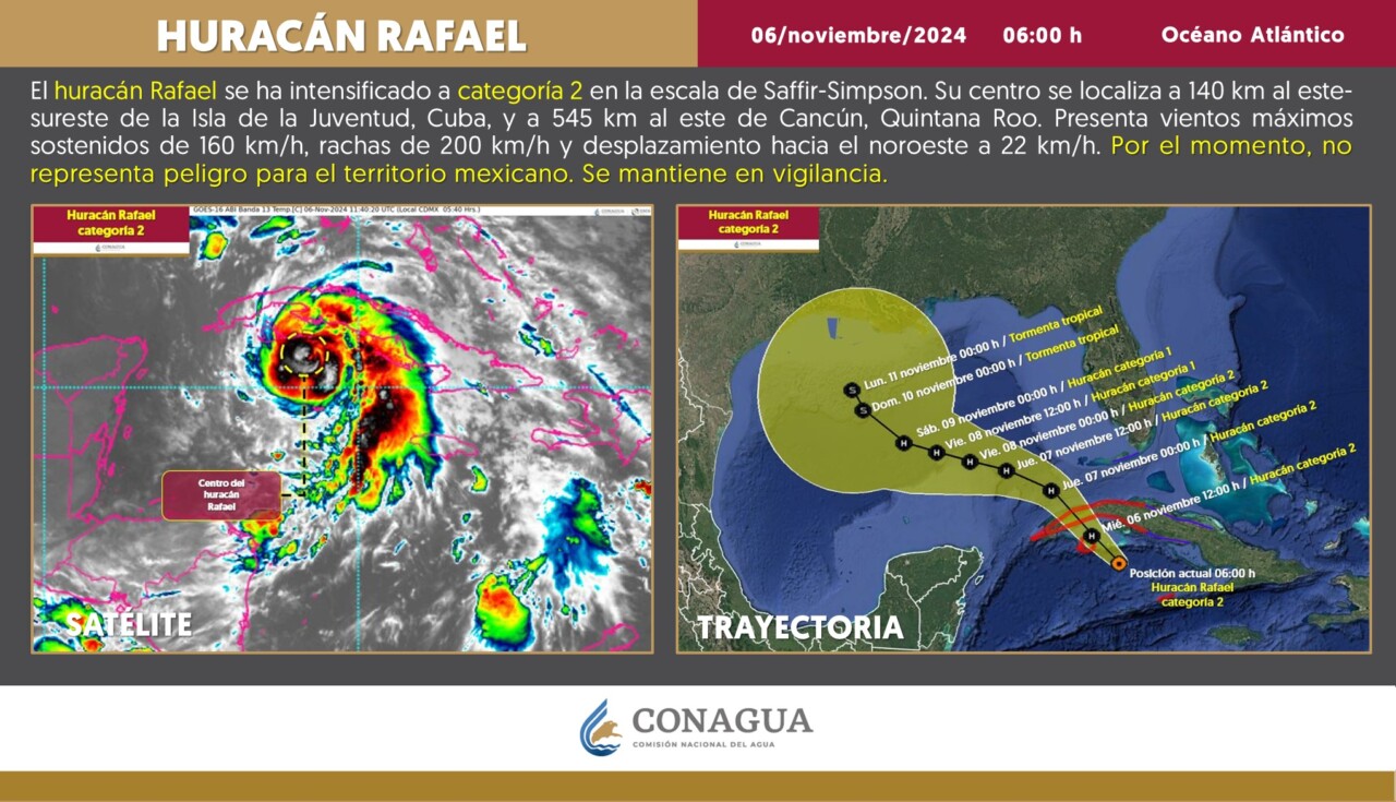 Por otra parte, los desprendimientos nubosos del huracán Rafael, que se desplazará sobre el occidente de Cuba, reforzarán la probabilidad de lluvias con chubascos en la península de Yucatán. Finalmente, se mantendrá el ambiente vespertino caluroso sobre entidades del Pacífico Sur y península de Yucatán.