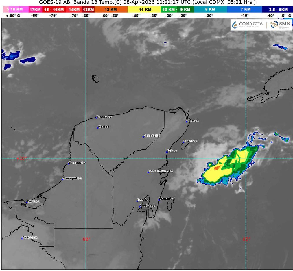Pronóstico del clima en Quintana Roo para hoy miércoles 8 de abril 2026.- Para este día, el frente frío número 43, con características de estacionario sobre el este de la Península de Yucatán, propiciará chubascos en Quintana Roo; y lluvias aisladas en zonas de Campeche y Yucatán. A su vez, canales de baja presión sobre el noreste y sureste del país en combinación con inestabilidad atmosférica y con el ingreso de aire húmedo del océano Pacífico y golfo de México, originarán lluvias puntuales muy fuertes en Tlaxcala, Puebla, Veracruz y Oaxaca; lluvias puntuales fuertes en Nuevo León, Tamaulipas, Hidalgo, Estado de México y Chiapas.