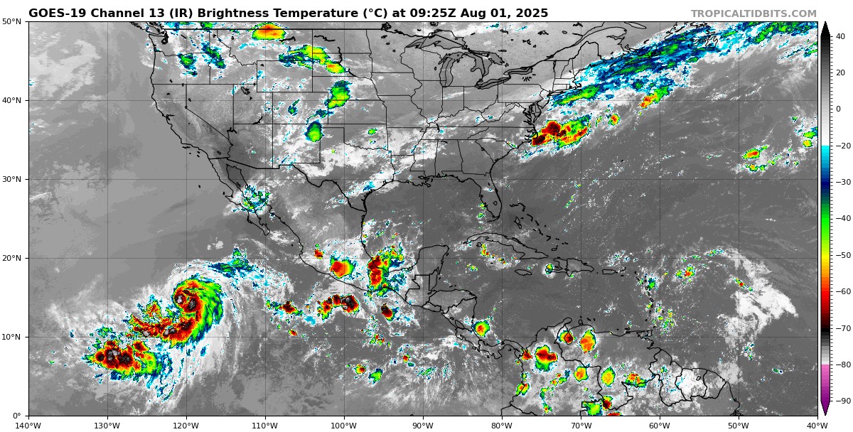 El desplazamiento de la onda tropical número 17, sobre el occidente del país, originará lluvias puntuales intensas con descargas eléctrica en Jalisco, Colima y Michoacán, y con posible caída de granizo en zonas altas de Jalisco. Se prevé que dicha onda continúe avanzando hacia el oeste y dejando de afectar al país al final del día. Otro canal de baja presión sobre Chiapas y Tabasco y la entrada de aire húmedo del mar Caribe, en interacción con la onda tropical número 18 que se desplazará sobre el sureste y sur del territorio nacional, propiciarán lluvias puntuales muy fuertes en Chiapas, Oaxaca y Veracruz; y puntuales fuertes en Quintana Roo, Yucatán, Campeche y Tabasco, todas acompañadas con descargas eléctricas.
