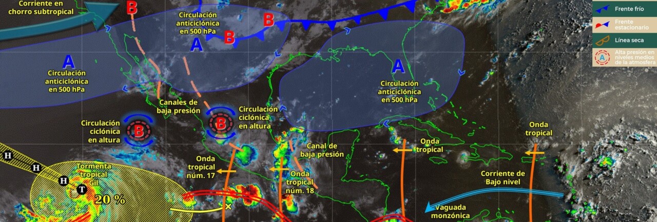El desplazamiento de la onda tropical número 17, sobre el occidente del país, originará lluvias puntuales intensas con descargas eléctrica en Jalisco, Colima y Michoacán, y con posible caída de granizo en zonas altas de Jalisco. Se prevé que dicha onda continúe avanzando hacia el oeste y dejando de afectar al país al final del día. Otro canal de baja presión sobre Chiapas y Tabasco y la entrada de aire húmedo del mar Caribe, en interacción con la onda tropical número 18 que se desplazará sobre el sureste y sur del territorio nacional, propiciarán lluvias puntuales muy fuertes en Chiapas, Oaxaca y Veracruz; y puntuales fuertes en Quintana Roo, Yucatán, Campeche y Tabasco, todas acompañadas con descargas eléctricas.