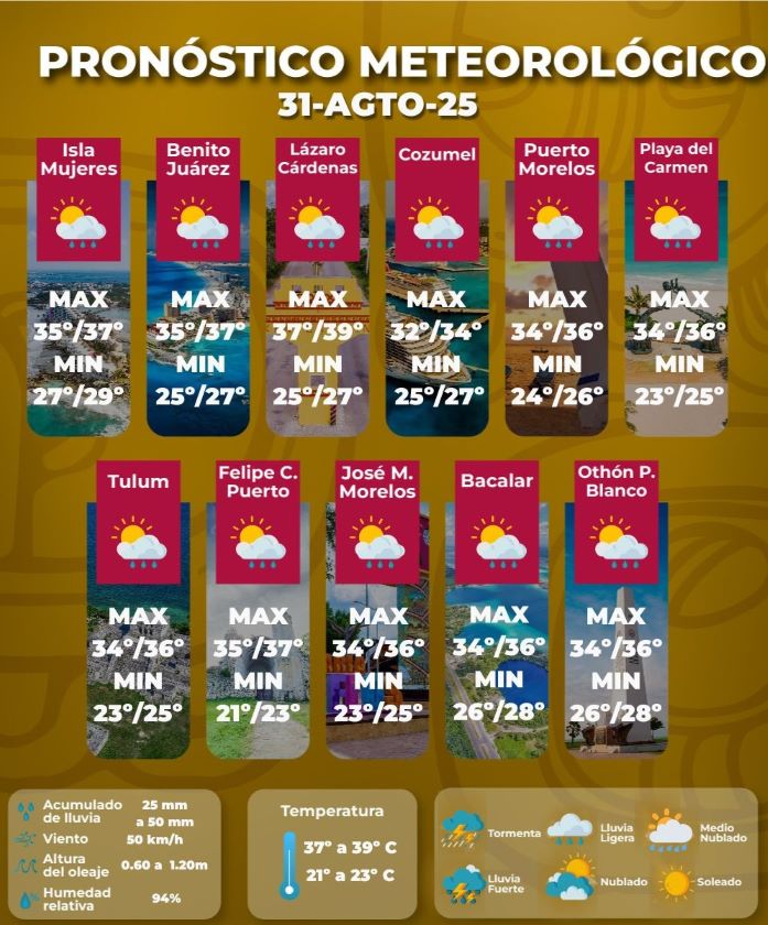 Península de Yucatán: Por la mañana, cielo medio nublado y ambiente cálido. Posibilidad de lluvias aisladas matutinas. Durante la tarde, ambiente cálido a caluroso; cielo nublado con lluvias puntuales fuertes acompañadas con descargas eléctricas en Yucatán, Campeche y Quintana Roo.