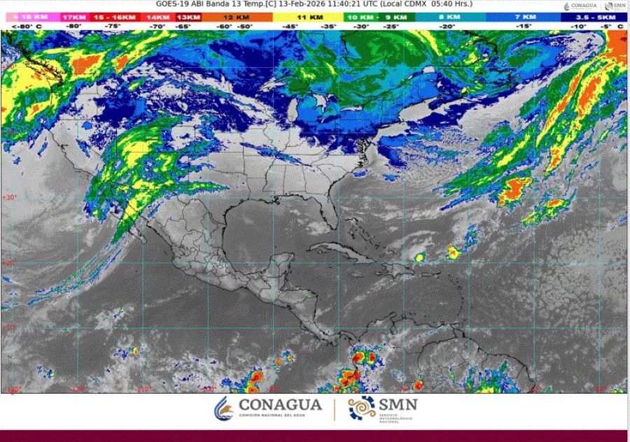 Pronóstico del clima en Quintana Roo para hoy viernes 13 de febrero 2026.- Para este día, el frente frío número 34 se desplazará sobre el noroeste y norte de la República Mexicana, interaccionará con la vaguada polar y con las corrientes en chorro polar y subtropical, ocasionarán vientos fuertes a muy fuertes, lluvias y chubascos en dichas regiones, además de lluvias puntuales fuertes en Sonora y Chihuahua; así como posible caída de nieve o aguanieve en las sierras de Baja California, Sonora y Chihuahua.