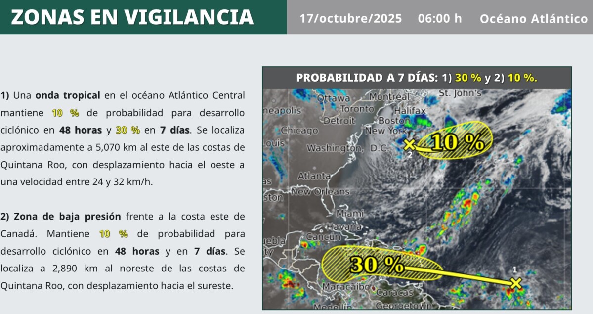 Pronóstico del clima en Quintana Roo para hoy viernes 17 de octubre 2025.- Para este día, una zona de baja presión con probabilidad para desarrollo ciclónico frente a las costas del Pacífico Sur mexicano y el ingreso de humedad generarán lluvias muy fuertes en Guerrero y Oaxaca, además de oleaje elevado en la costa de Oaxaca.