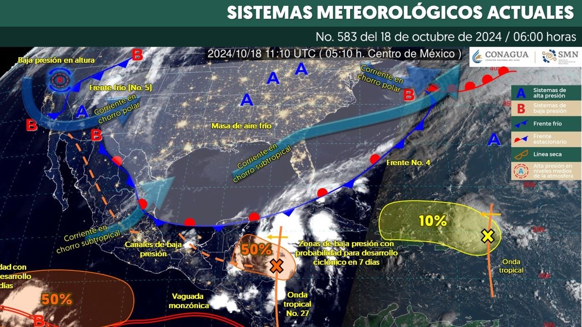 Por otro lado, un nuevo frente frío (No. 5) ingresará al noroeste del territorio nacional y, en interacción con un centro de baja presión en altura y con la corriente en chorro polar, generará descenso de temperatura, vientos fuertes a muy fuertes con tolvaneras, además de incrementar la probabilidad de lluvias en la región mencionada.