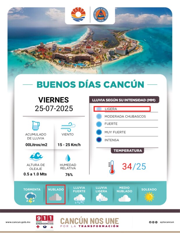 Pronóstico del clima en Quintana Roo para hoy viernes 25 de julio 2025.- Para este día, una circulación ciclónica en niveles altos de la atmósfera sobre el sureste mexicano, en interacción con el ingreso de humedad del Golfo de México y mar Caribe, ocasionará lluvias puntuales muy fuertes en dicha región, incluida la Península de Yucatán.