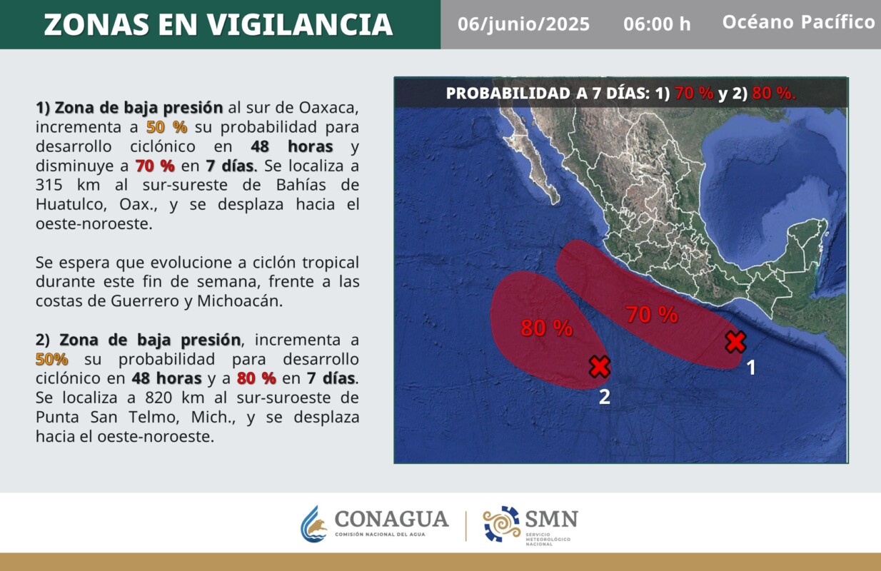Asimismo, se pronostican vientos fuertes y oleaje elevado en las costas del Pacífico Mexicano.